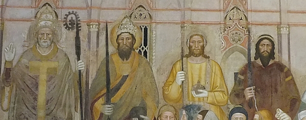 Da sinistra, i tre fratelli Visconti. Nell’ordine: Matteo, Galeazzo e Bernabò. Ultimo a sinistra, lo zio, l’arcivescovo Giovanni. |