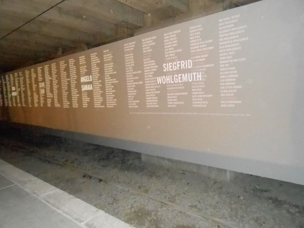Oltre i vagoni, nel Memoriale c’è una grande installazione con sfondo nero su cui compaiono 774 nomi. Essi rappresentano il carico umano dei convogli partiti da qui il 6 dicembre 1943 e il 30 gennaio 1944 dalla stazione con destinazione Auschwitz-Birkenau. Di queste persone, solo 27 sopravvissero. Sulla banchina, ci sono delle targhe con delle date, ognuna delle quali rappresenta una partenza. Altrove si può accedere anche a un grande spazio chiuso di forma conica, dedicato al raccoglimento, alla meditazione, alla preghiera, per credenti e non credenti. In altre parole, dedicato alla memoria.