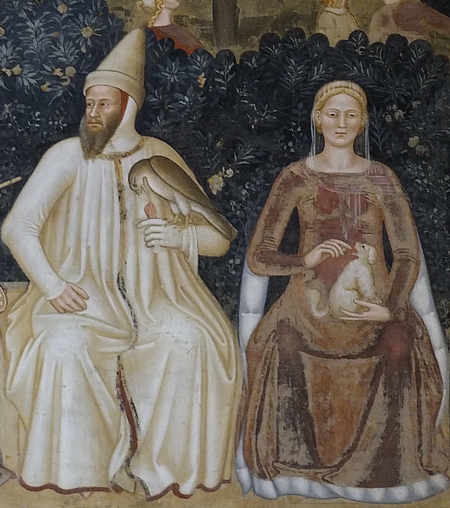 Ed è qui che entra in campo Beatrice Regina, ovvero la primogenita di Mastino II della Scala, signore di Verona, Vicenza, Padova, Parma, Brescia e Lucca, e di Taddea di Carrara. La potete vedere qui, nell’affresco di Santa Maria Novella a Firenze, accanto al marito. Lei tiene in grembo un cagnolino, lui regge sul braccio un falco e ha un curioso copricapo. Bernabò ha i capelli biondicci, mentre pare avesse occhi e barba nerissimi, essendo figlio di una Doria. Lei è pure bionda e ha gli zigomi alti secondo i canoni di bellezza dell’epoca, per cui può essere che fossero ritratti idealizzati.