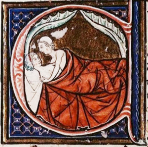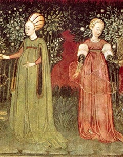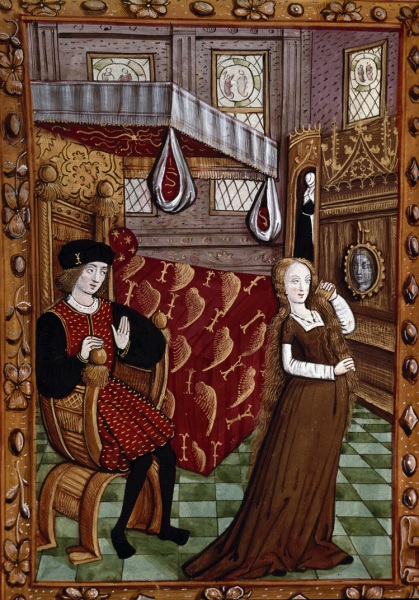 La cugina del conte Stefano Porro di Brianza, Donnina, figlia del giureconsulto Leone Porro di Copreno, fu a partire dagli anni 1360 una vera, seconda consorte di Bernabò Visconti, al quale diede almeno quattro figli, che ricevettero nomi a ricordo delle chansons de geste tanto in voga, come Lancilotto. Bernabò la chiamava affettuosamente col cognome “la Porrina“. Non si conoscono ritratti di Donnina, per cui ho scelto una scena a mia discrezione di epoca un poco più tarda, che raffigura una coppia in un interno.