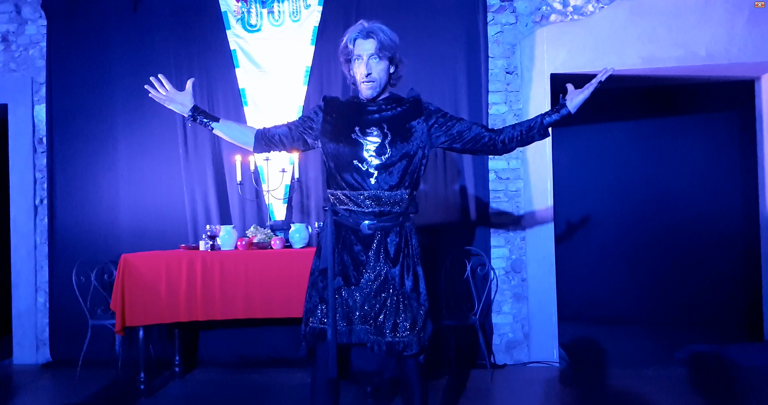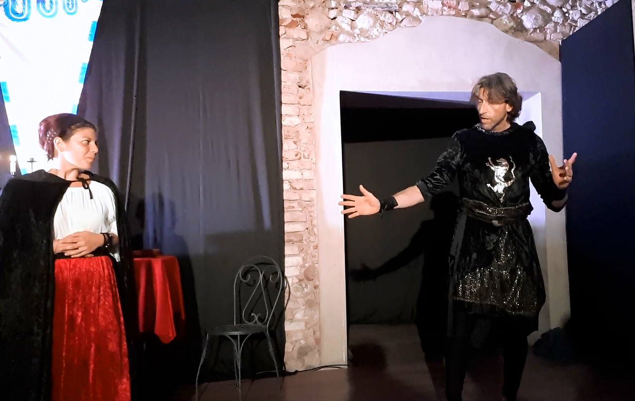 Il problema con i copioni teatrali è che devono essere rappresentati. Infatti è vero che con l'altro mio lavoro, Il Canarino, avevo vinto un premio, ma non era mai stato rappresentato ed è rimasto sulla pagina. Qui il copione è stato commissionato dal regista Claudio che è di Trezzo e quindi c'era l'idea di incentrare il tutto su un personaggio. il Visconti, molto presente in quei luoghi. Quindi, a meno che il mio copione non si fosse rivelato una "sola" – tutto poteva essere! 😉 – l'allestimento scenico era quasi sicuro.
