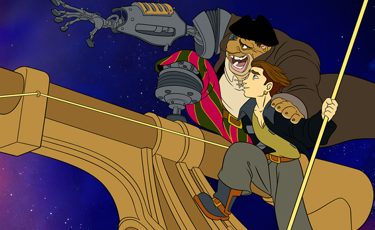 Nel 2002 è stato realizzato questo originale cartone animato dove il romanzo viene trasposto in forma fantascientifica. In questa versione John Silver è un cyborg (metà biologico e metà macchina): ha una gamba meccanica, un braccio meccanico mille usi (come un coltellino svizzero molto elaborato) e una parte della testa (un occhio meccanico che può fungere da mirino e raggio x, ed un orecchio cibernetico) ed è a capo della banda dei pirati del film. In questo cartone animato è particolarmente evidente il rapporto padre-figlio tra Silver e Jim, a caccia del Bottino dei Mille Mondi di Flint.